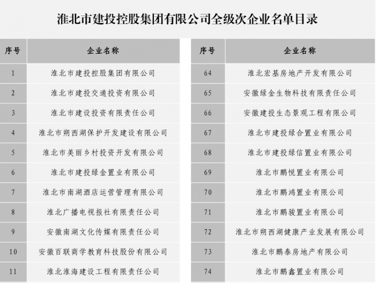 淮北市建投控股集團(tuán)有限公司全級(jí)次企業(yè)名單目錄