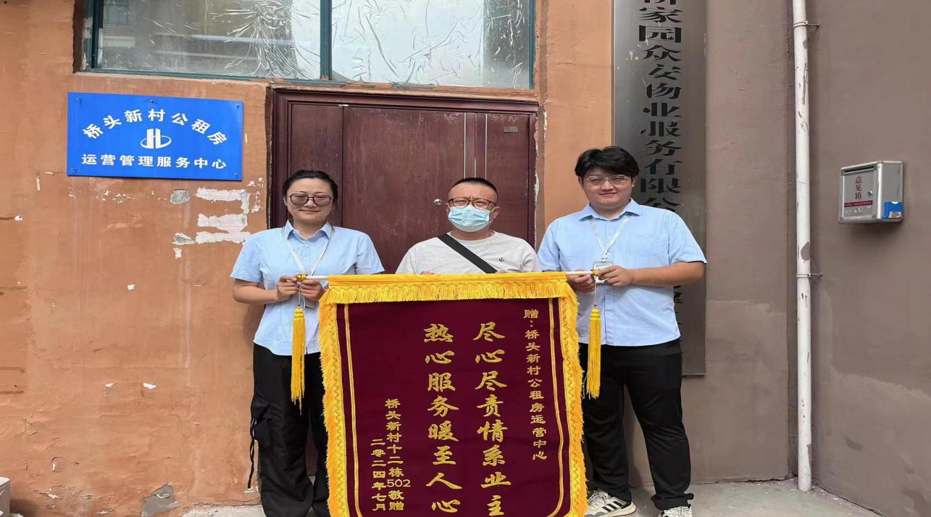 近日,保障房、物業(yè)公司管理運(yùn)營(yíng)的橋頭新村公租房租戶黃先生將一面寫有“熱心服務(wù)暖至人心,盡心盡責(zé)情系業(yè)主”的錦旗,送到公租房運(yùn)營(yíng)管理服務(wù)中心,對(duì)工作人員提供優(yōu)質(zhì)服務(wù)、快速解決租戶困難表示肯定和感謝。