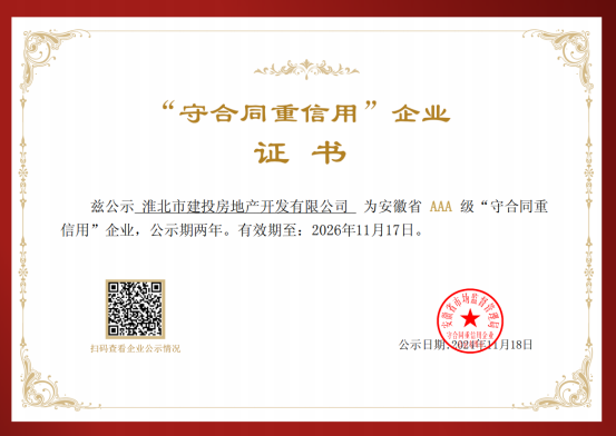 1118日,省市場(chǎng)管理監(jiān)督局發(fā)布了2022-2023年安徽省AAA級(jí)“守合同重信用”企業(yè)信用等級(jí)評(píng)定結(jié)果,淮北市建投房地產(chǎn)開(kāi)發(fā)有限公司憑借良好的綜合實(shí)力和市場(chǎng)滿意度、信譽(yù)度,獲評(píng)“AAA”級(jí)守合同重信用企業(yè)稱號(hào),成為全省618家“AAA”級(jí)信用企業(yè)之一。