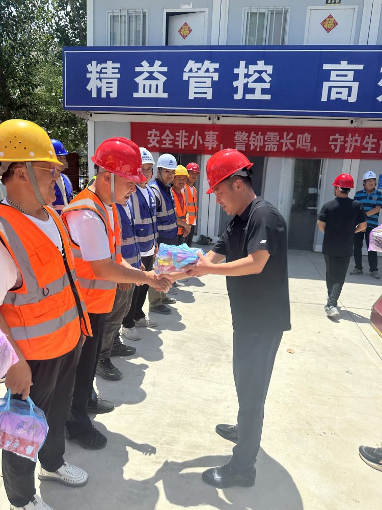 在項(xiàng)目現(xiàn)場,趙焱將防暑降溫物資送到一線施工人員手中,對他們在高溫環(huán)境下堅(jiān)守崗位、辛勤付出表示感謝,同時(shí)叮囑大家要注意防暑降溫,確保自身安全與健康。