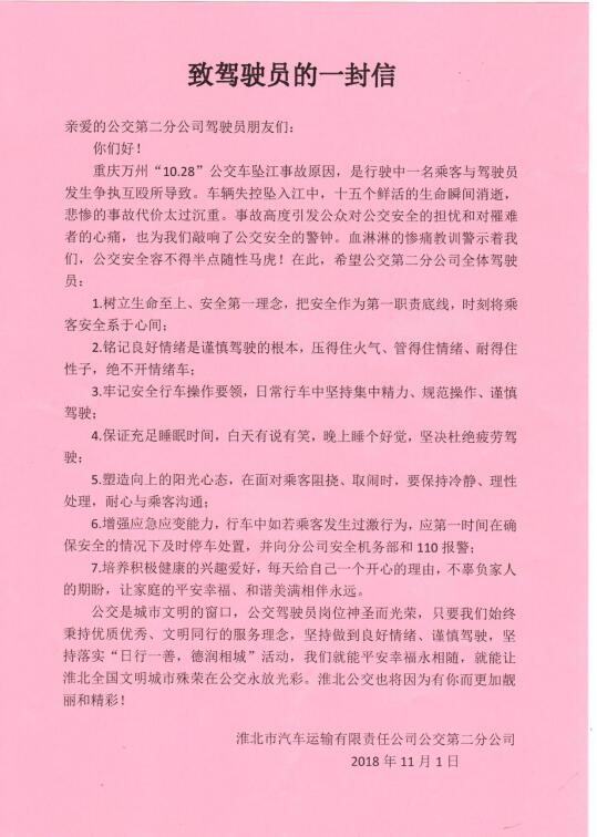 因此,公交第二分公司組織全體駕駛員進(jìn)行警示教育學(xué)習(xí),并向每一位公交司機(jī)師傅致一封信,讓師傅們時刻牢記作為司機(jī),當(dāng)你坐在駕駛座上,手握方向盤時,就應(yīng)有清晰的認(rèn)識。此時你握著的,不僅僅是自己的性命,更是與你同車的人、和路上與你擦肩而過的無數(shù)人的安全。平白無故挨了打,怒從膽邊生,生氣都在所難免。時刻樹立生命至上、安全第一理念,把安全作為第一職責(zé)底線,將乘客安全系于心間。